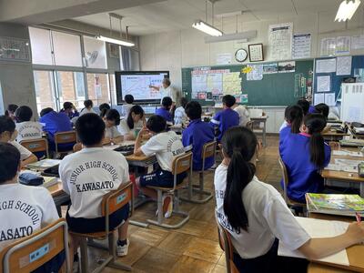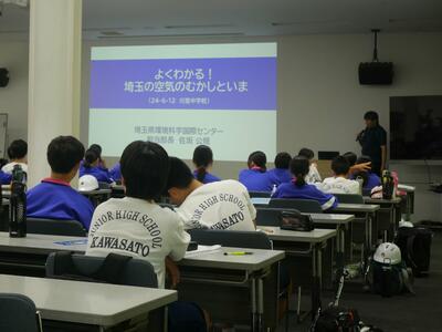 ちょうど職場体験で来ていた2年生にもレクチャーを受けながら、埼玉県の名所を見られるVRを体験したり、「埼玉の空気について」の講義を聴いたりしました。