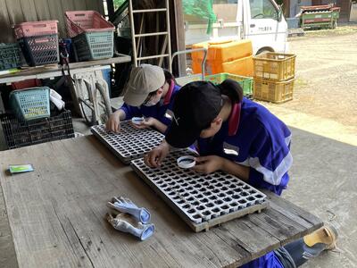 【生産業・Wさん】…毎朝出荷に行きました。直売所・無人販売所・イ○○。イ○○では普段は入れない搬入口や裏側に入れて貴重な体験でした。開店前でイ○○が貸切状態でした。…ヤギやウサギの世話もしました。…乳搾りでは、台にヤギが乗ってくれず大変でした。1L以上とれたのでよかった。翌日、ヤギの乳でプリンをつくってくれました。あっさりしているプリンです。玉ネギを3人で1時間に2000個も収穫しました。15ケース分になりびっくりです。…「就職できなかったらここにおいで」と言われた(笑)。とても楽しかったです。