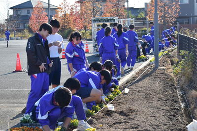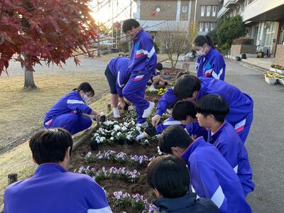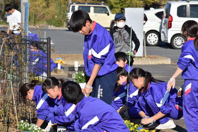 環境委員の他にボランティアの生徒50人とPTAの皆様にもお手伝いいただき、800株のパンジーとビオラの植え付けが完了しました。