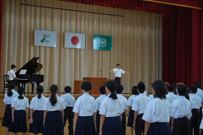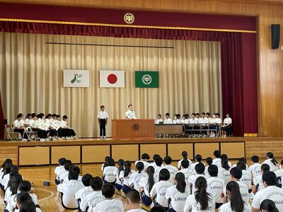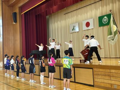 2学期2日目。気合いのこもった全体練習が体育委員長を中心に行われました。暑さもあるので、休憩を取りながら、開会式の練習ができました。