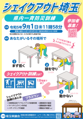 「関東大震災の発生から100年を迎える節目にあたり、大震災の教訓を再認識し、災害への備えと対応力を一層高める機会として、県議会主催のシェイクアウト訓練を実施します。シェイクアウト訓練は、短時間で、誰でも、どこにいても実施できる訓練ですので、奮ってご参加ください!」という呼びかけが埼玉県議会からあり、本校も「シェイクアウト埼玉~県内一斉防災訓練~」に全校で参加しました。