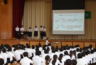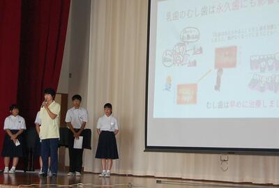 1学期の終業式の日に学校保健委員会でも発表していました保健委員会が、今回は全校に向けての発表です。テーマは「素敵な笑顔できらりと輝く歯のために」として、歯の健康の保ち方と、もう一つ・・・養護教諭からは10月から本格実施となるフッ化物洗口についての説明をしました。