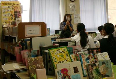 図書支援員さんによる1年生対象の「川里中学校図書室の説明会」が